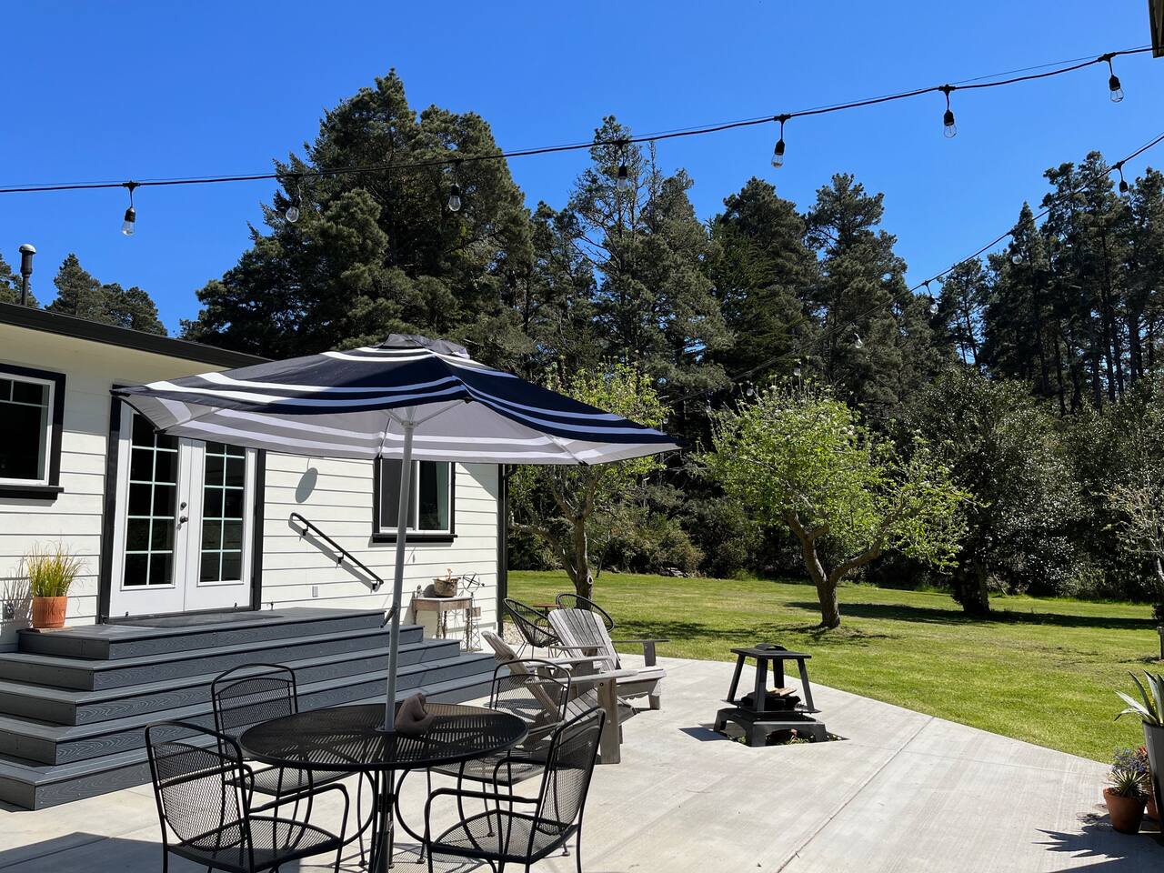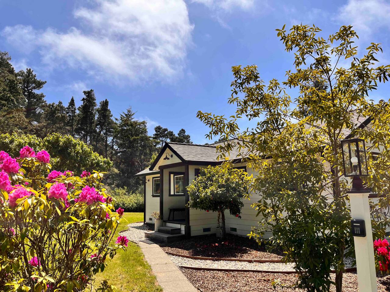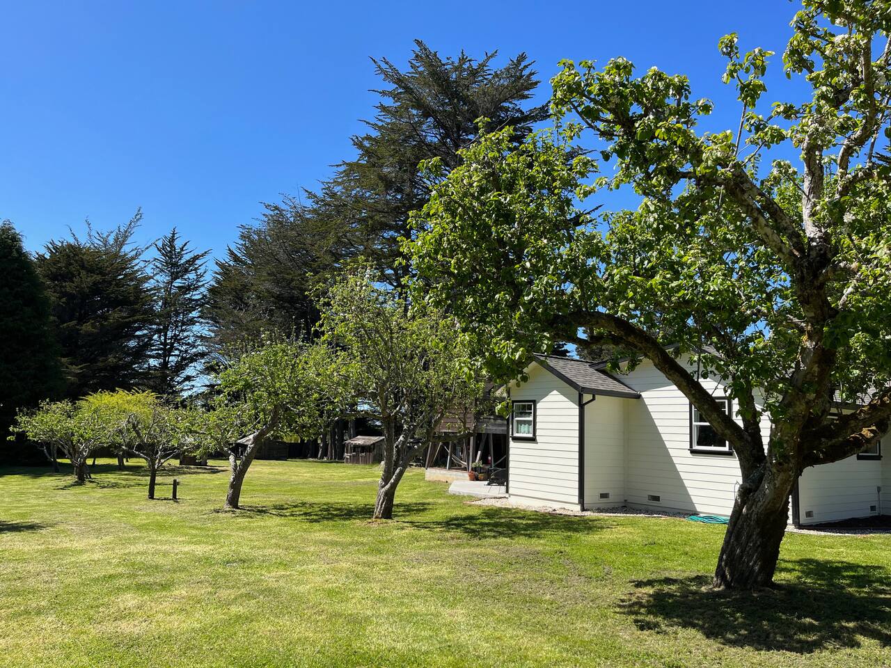Modern farmhouse cottage set on 5 private acres including an apple orchard, original water tower, outbuildings and several majestic cypress and cedar trees. The home offers elegance and comfort rarely available on the coast. You will find that any stay here is as much about enjoying the land as it is the house. Once an active homestead, this property is simply a delight to experience.