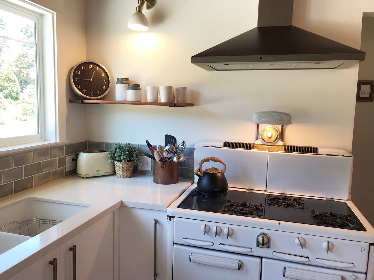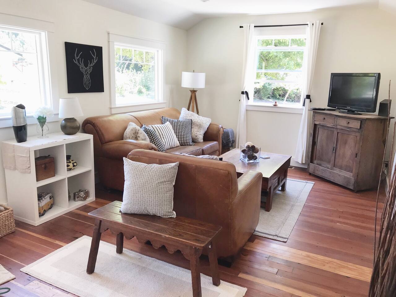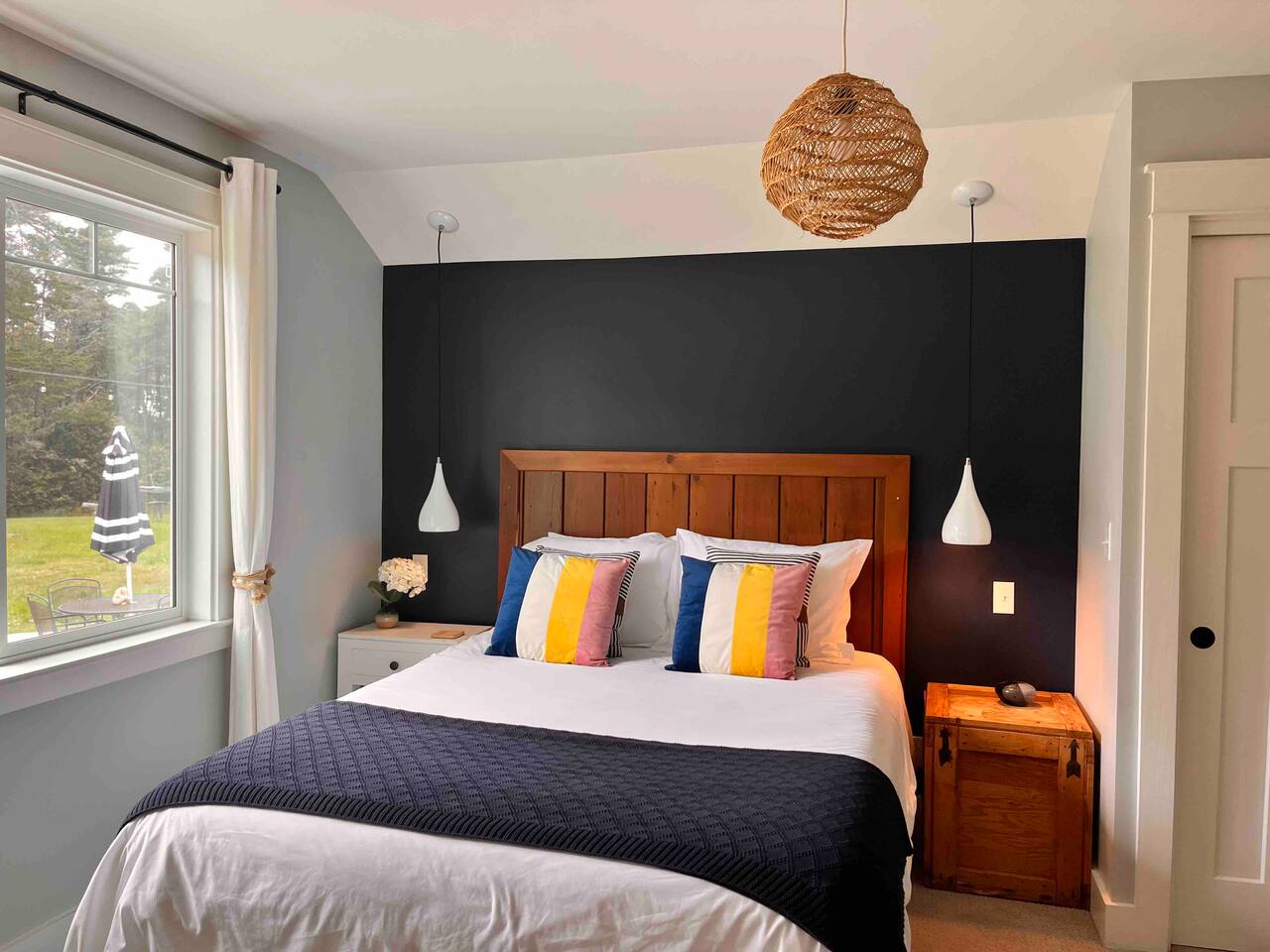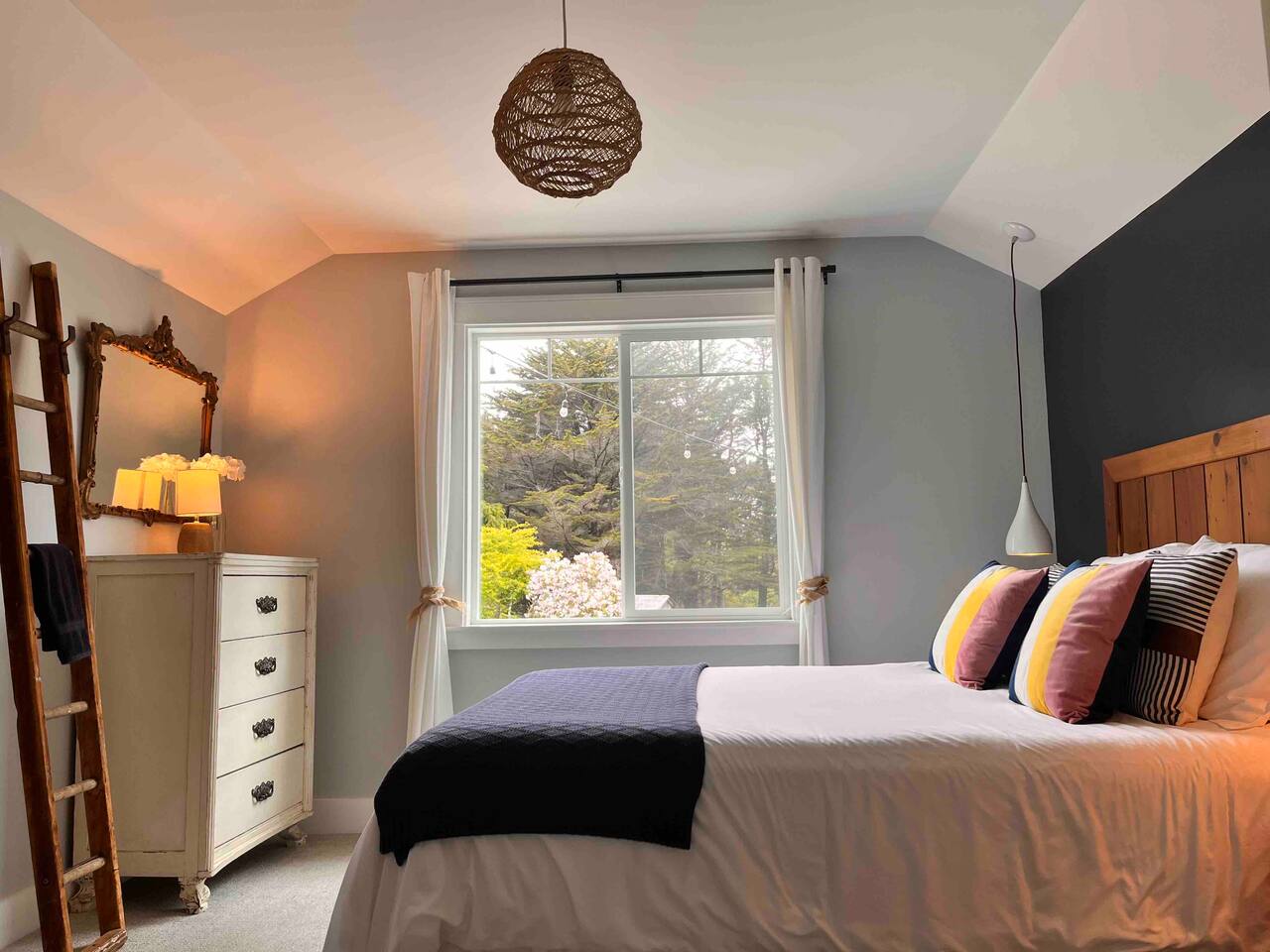 Modern farmhouse cottage set on 5 private acres including an apple orchard, original water tower, outbuildings and several majestic cypress and cedar trees. The home offers elegance and comfort rarely available on the coast. You will find that any stay here is as much about enjoying the land as it is the house. Once an active homestead, this property is simply a delight to experience.