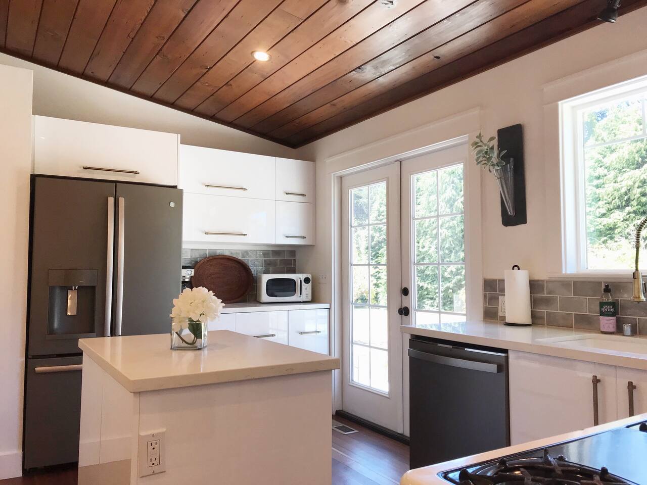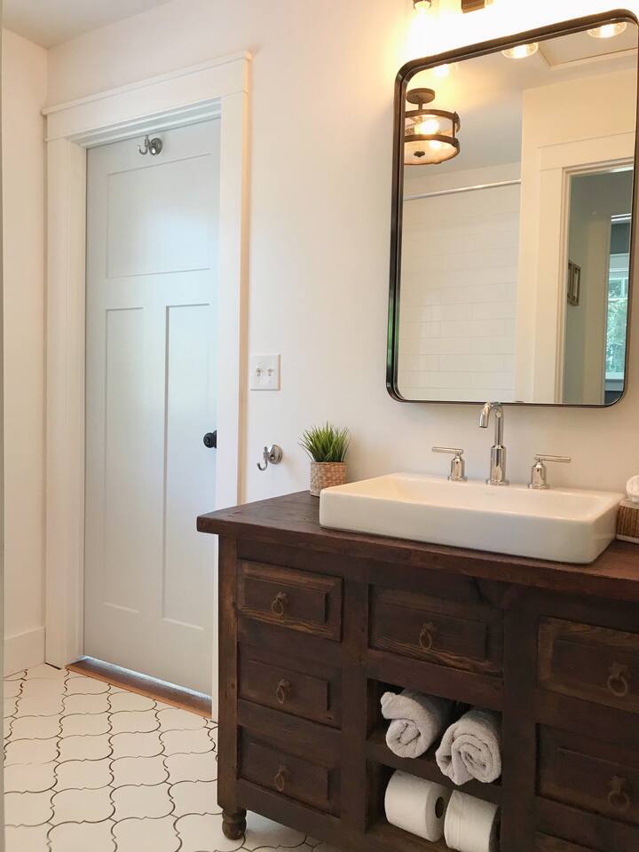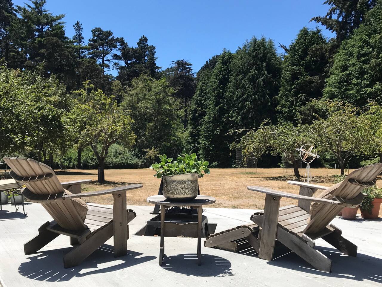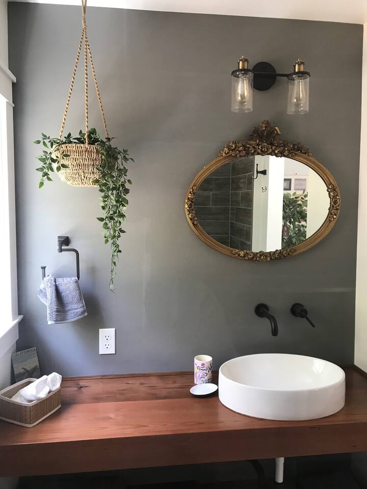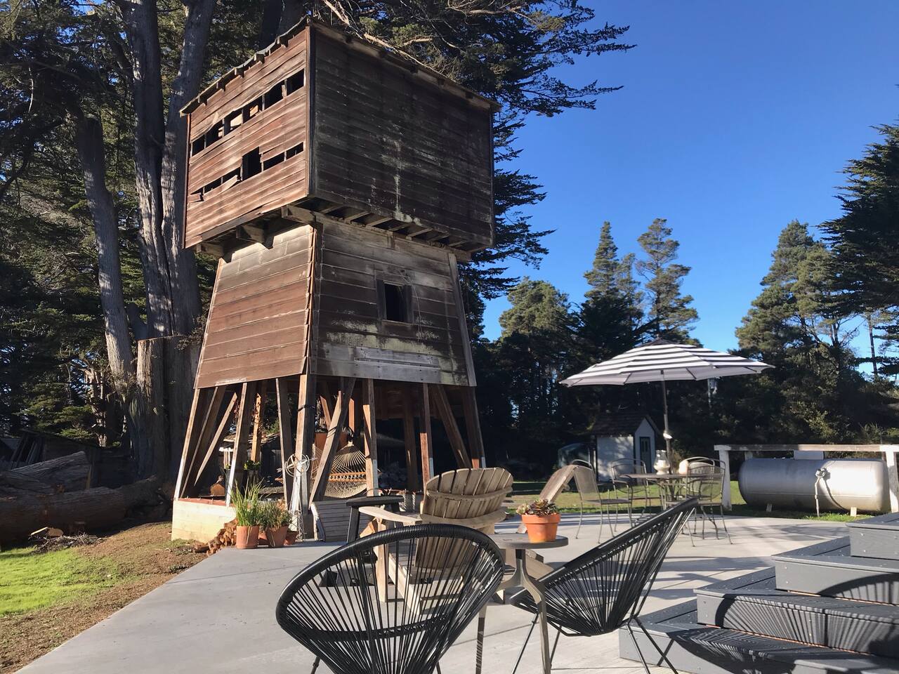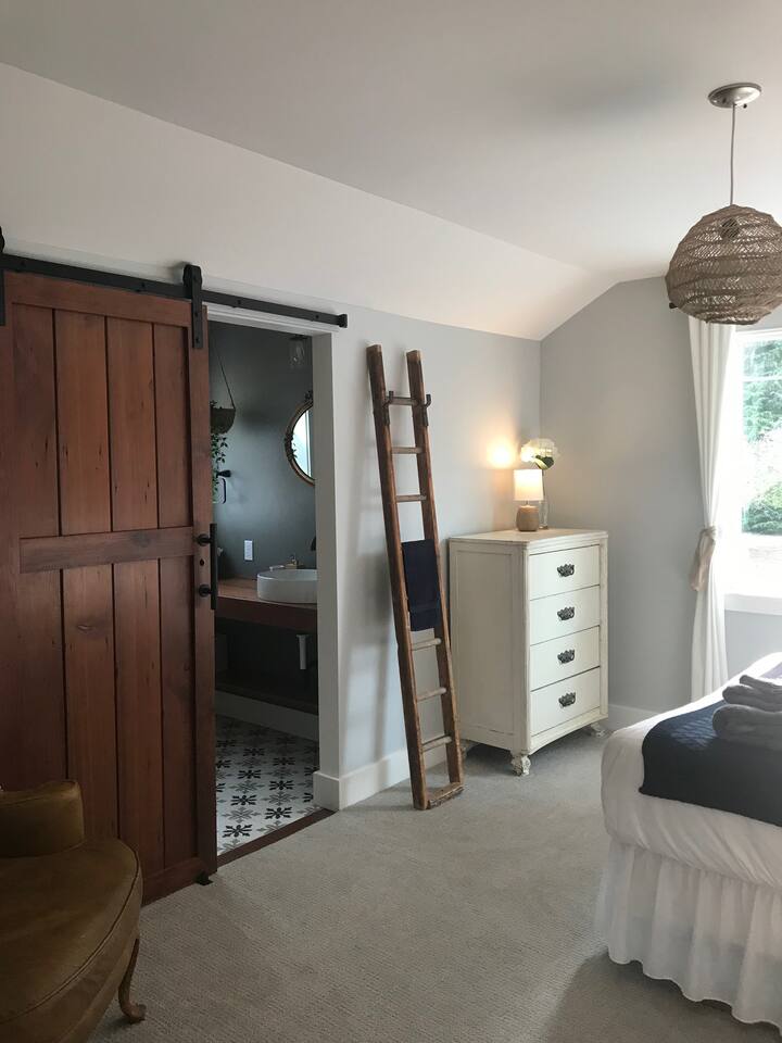 The recently renovated home has two similarly sized bedrooms, each with an ensuite bathroom, a living room and a modern kitchen/diner that opens onto the south facing patio, complete with fire pit. The bedrooms each have a queen bed, accommodating 4 guests. 1 additional guest can be accommodated on a single fold up bed, which can be set up on request (prior to arrival) in either of the bedrooms. A spacious patio links the home to the water tower, which offers a hammock retreat space. This is the place to watch the wildlife in the morning, or enjoy the sun setting on the treetops by the fire pit in the evening. The house has been meticulously refurbished using old growth redwood, salvaged from the home during the remodel. Featuring many modern amenities, the renovated space still honors the property's 100 year-plus homestead history. Internet service is provided by Comcast/Xfinity high speed cable, ideal for guests planning to work during their stay. An on site washer and dryer can be made available for guests on longer stays. There are 13 well established apple trees on the property, from which guests can enjoy picking their own apples during harvest season, September through November. Each season though brings its own natural joys, such as the apple blossom in March, the magnificent rhododendrons in April or the foxgloves in June.